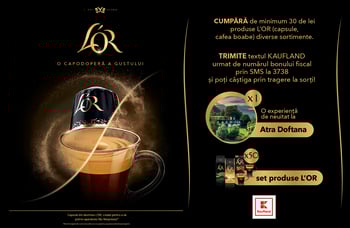 Campanie valabilă în perioada 01-07.06.2022. Cumpară produse participante în valoare de minimum 30 de lei, trimite SMS cu textul KAUFLAND urmat de numărul bonului fiscal la 3738 (*tarif normal operabil în rețelele Orange, Vodafone, Telekom şi Digi) şi poți castiga o experiență de neuitat la Atra Doftana sau unul din cele 50 de set-uri de produse L’OR. Produse participante: toate produsele L’OR (cafea boabe, capsule Caştigătorii premiilor se stabilesc prin tragere la sorți, conform regulamentului campaniei. Pastrați bonul fiscal în original, nedeteriorat. Imaginile premiilor sunt cu titlu de prezentare. Valoarea totală a premiilor este de 15.840,5 RON (TVA inclus).