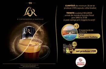 Campanie valabilă în perioada 15-28.04.2022. Cumpară produse participante în valoare de minimum 30 de lei, trimite SMS cu textul SELGROS urmat de numărul bonului fiscal la 3738 (*tarif normal operabil în rețelele Orange, Vodafone, Telekom şi Digi) şi poți castiga o experiență de neuitat la hotel Panoramic Colibița sau unul din cele 30 de set-uri de produse L’OR. Produse participante: toate produsele L’OR (capsule, cafea boabe). Înscrierea în campanie implică acceptarea regulamentului acesteia, disponibil pe www.lorcoffee.ro/campanii/. Caştigătorii premiilor se stabilesc prin tragere la sorți, conform regulamentului campaniei. Pastrați bonul fiscal în original, nedeteriorat. Imaginile premiilor sunt cu titlu de prezentare. Valoarea totală a premiilor este de 9.364,4 RON (TVA inclus).